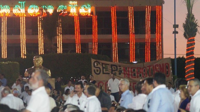 «Siguiendo el ejemplo de mi padre, la educación será la columna vertebral de mi administración», lanzó, mientras de fondo se escuchaban los gritos de ¡Demagogia! ¡Mentiras!, de parte de profesores disidentes.