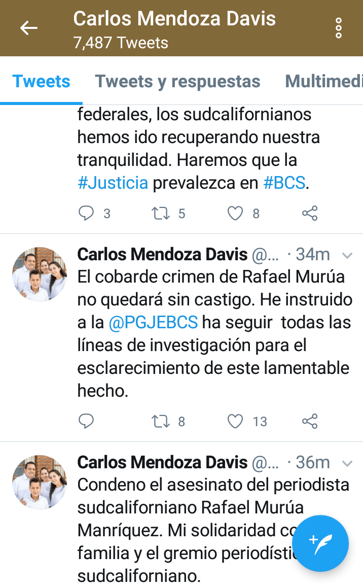 “Condeno el asesinato del periodista sudcaliforniano Rafael Murúa Manríquez. Mi solidaridad con su familia y el gremio periodístico sudcaliforniano”, publicó en su cuenta de Twitter.